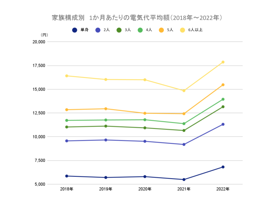 電気代・ガス代のいずれも、どの世帯構成においても、2021年以前と比較すると2022年は平均額が高くなっていることが読み取れます。特に電気代の高騰は顕著で、5人世帯では2018年に12,846円だった平均額が2023年には120.46%増の15,474円になっています。