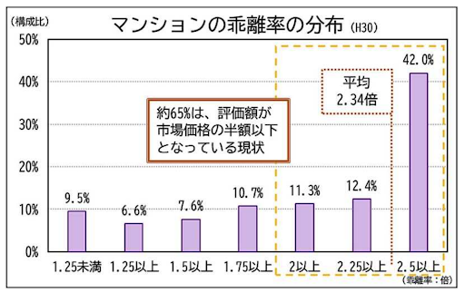 一方で、マンションの乖離率の平均は2.34倍です。つまり、マンションの相続税評価額は時価の4割程度となります。