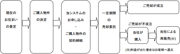 買換え等で現在のお住まいをご売却されるお客様に対し、当該不動産のご売却を当社の仲介で一定期間引き受けることを条件に、期間内に売却できなかった場合、あらかじめお約束した価格で当社が購入させていただく制度です。また、当システムには「利益還元制度」(※2)が付いており、当社購入後、当社税抜き再販売価格から当社経費を差し引いて利益が出た場合、利益をお客様に還元いたします。