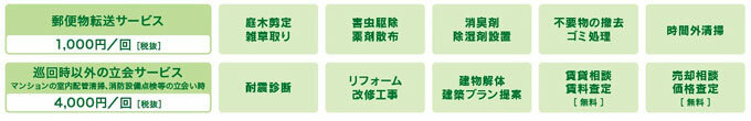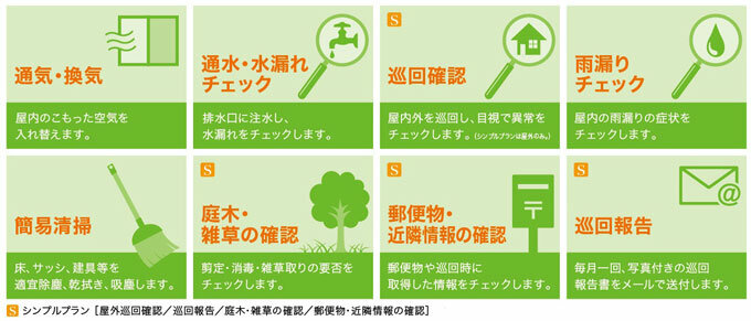 本サービスでは、3種類のプランをご用意しており、毎月1回屋外のみを巡回する「シンプルプラン」(一戸建のみ)、毎月1回屋内外を巡回する「スタンダードプラン」、毎月2回屋内外を巡回する「エクセレントプラン」の中から、お客様のご希望に合わせてお選びいただけます。