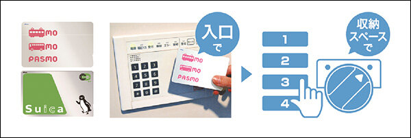 入館カードとしてお客様がお手持ちのPASMO、Suicaを採用。各カード裏面の番号をご登録いただくだけで、上限3枚まで入館カードとして使用が可能となります。また、各収納スペースには暗証設定ダイヤル錠を採用。当施設専用の鍵が不要のため、急に利用したい場合にも対応可能です。