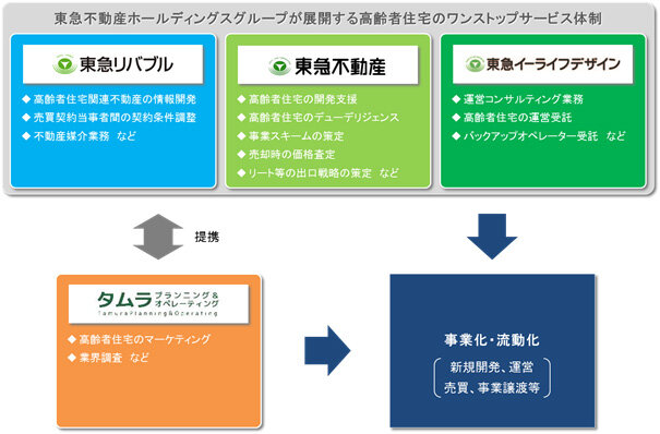 このたび提携する4社は、各専門分野においてヘルスケア施設に関する事業を展開しています。総合デベロッパーである東急不動産はヘルスケア施設の開発実績があり、東急イーライフデザインは施設運営を行っています。また、東急リバブルは総合不動産流通企業としてソリューション事業本部内にオペレーショナルアセットの専門チームを組成し、ヘルスケア施設の仲介サービスを強化しており、タムラプランニングアンドオペレーティングは高齢者住宅の開設を支援するコンサルティングを展開し、専門家に広範なネットワークを有しています。