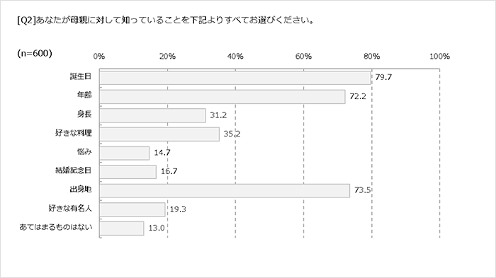 東急リバブルは動画の公開に合わせ、関東(東京都、神奈川県、千葉県、埼玉県、茨城県、栃木県、群馬県)在住の40歳~69歳男女600名に対して生活者調査を実施。「両親の健康を心配しているか」という調査項目では、約60%が心配を抱えているという結果に(グラフ1)。また、「母親について知っていること」の調査項目では、「誕生日・年齢・出身地」などは70%の対象者が「知っている」と回答している一方、「悩み」について知っていると答えられたのはわずか14.7%にとどまりました(グラフ2)。