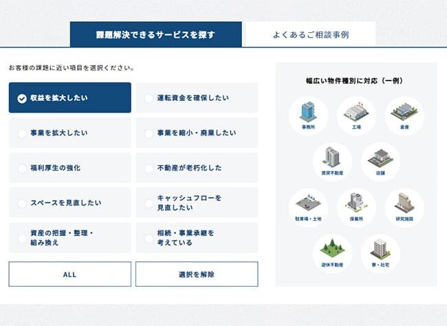 解決したい課題を大項目から選び、より細分化された項目を選択することで、個別要素に応じた解決策をご提案する仕組みになっています。