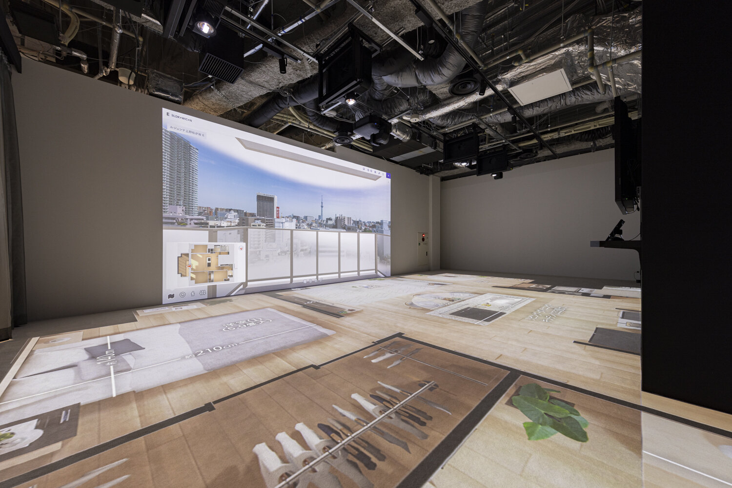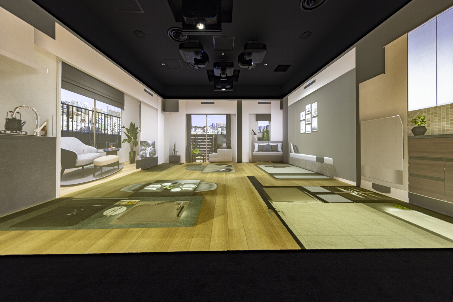 銀座サロンにてご提供するVRモデルルームは、住戸内の3DCGをシアタールームの床と壁に投影しており、お客様が室内空間を自由に行き来することができます。モニターやゴーグルで見るバーチャル空間では伝わりにくい、室内の広さや生活導線の確認、インテリアのシミュレーション、各階ごとの実際の眺望投影などにより、入居後のイメージをよりリアルに、室内にいるような没入感で体感いただけます。