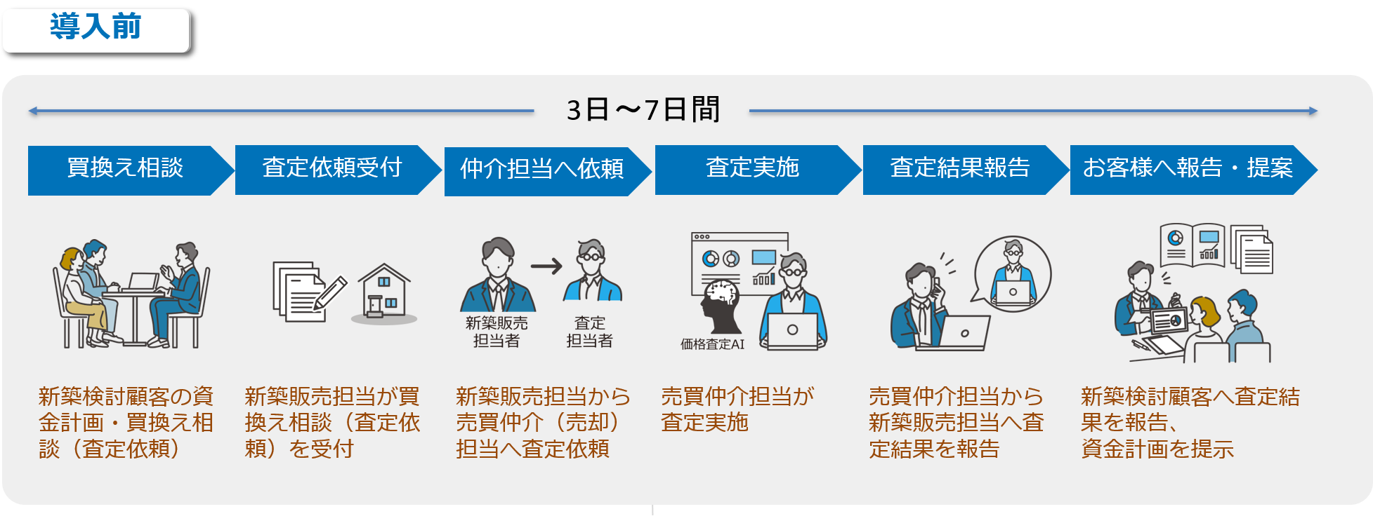 東急リバブルの新築販売においては、お客様の買換え相談に対して、新築販売担当者が直接査定業務を実施できないため、所有不動産所在地を営業圏とする東急リバブルの売買仲介店舗へ査定業務を依頼し、数日から1週間後に提出された査定書を基に、お客様へお伝えするという段階的な商談スキームで行っていました。