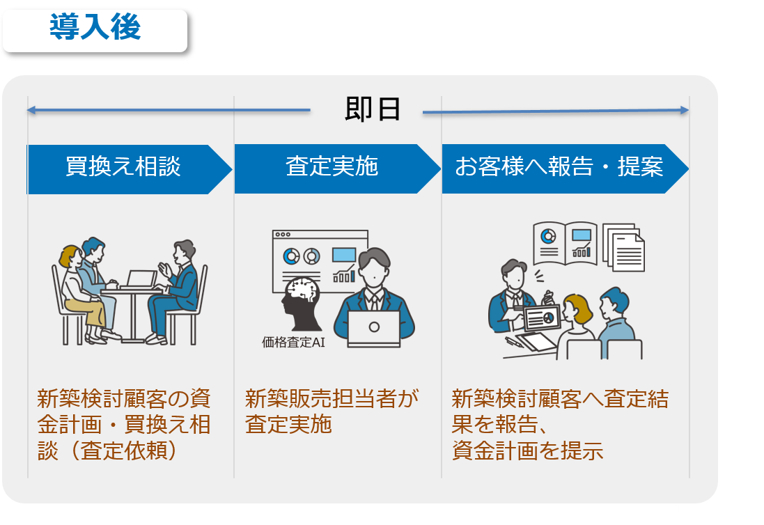 これにより、土地・戸建を所有されるお客様も早期に具体的な検討に入ることができ、機会を逃さず購入を判断することが可能となります。また、査定業務に関する更なる業務効率化が見込めます。