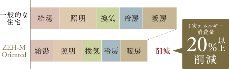 - 「ZEH」は年間の一次エネルギー消費量の収支をゼロとすることを目指した住宅です。「ZEH-M Oriented」は、強化外皮基準(断熱性能)を満たし、省エネによる一次エネルギー消費量を現行の省エネ基準値から20%削減とする基準です。(出典:環境・省エネルギー計算センターホームページ)