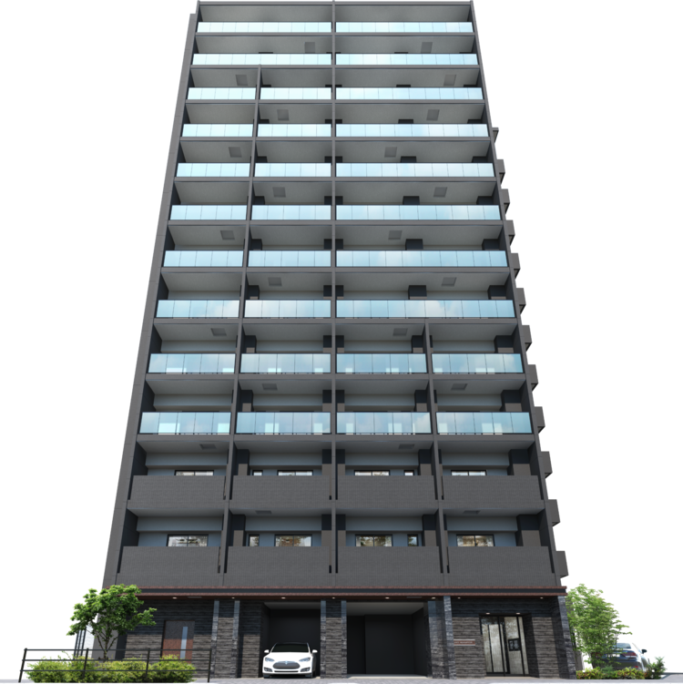 マンションの敷地は、2方向が通りに向けて開かれた開放感のある角地で、空間が開けたコーナー部分には植栽帯を設け、桜並木の冠新道への入口となる緑の風景をつくります。
