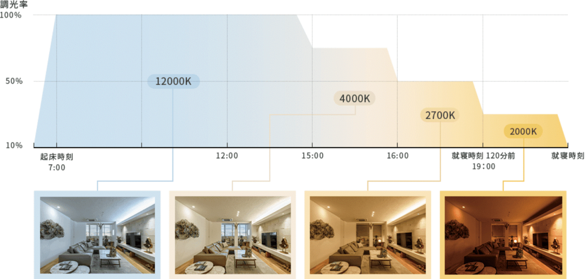 太陽(自然)に近い光を再現できる次世代LED調光システム「Synca」を採用。朝の目覚めから夜の就寝まで、生活シーンに適した光をタイマーなどで切り替えることで生活リズムを整え、快適な睡眠や健やかな暮らしを支えます。「Synca」の調光システムは、ルジェンテ西日暮里のVRモデルルームを開設した東急リバブル銀座サロンの体験ブースにて、実際にその調光システムを体験することができます。