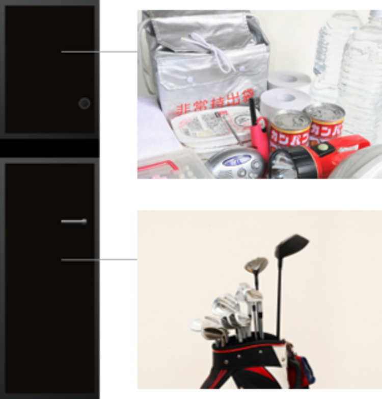 ルジェンテ西日暮里では、住戸玄関前まで荷物が届く「住戸前個別宅配BOX兼防災備蓄倉庫」を全戸に採用。上部には防災備蓄倉庫を設置し非常時に役立つ備品を保管、下部にはゴルフバッグなど大型の荷物が届いても収納できるゆとりあるスペースを確保しました。