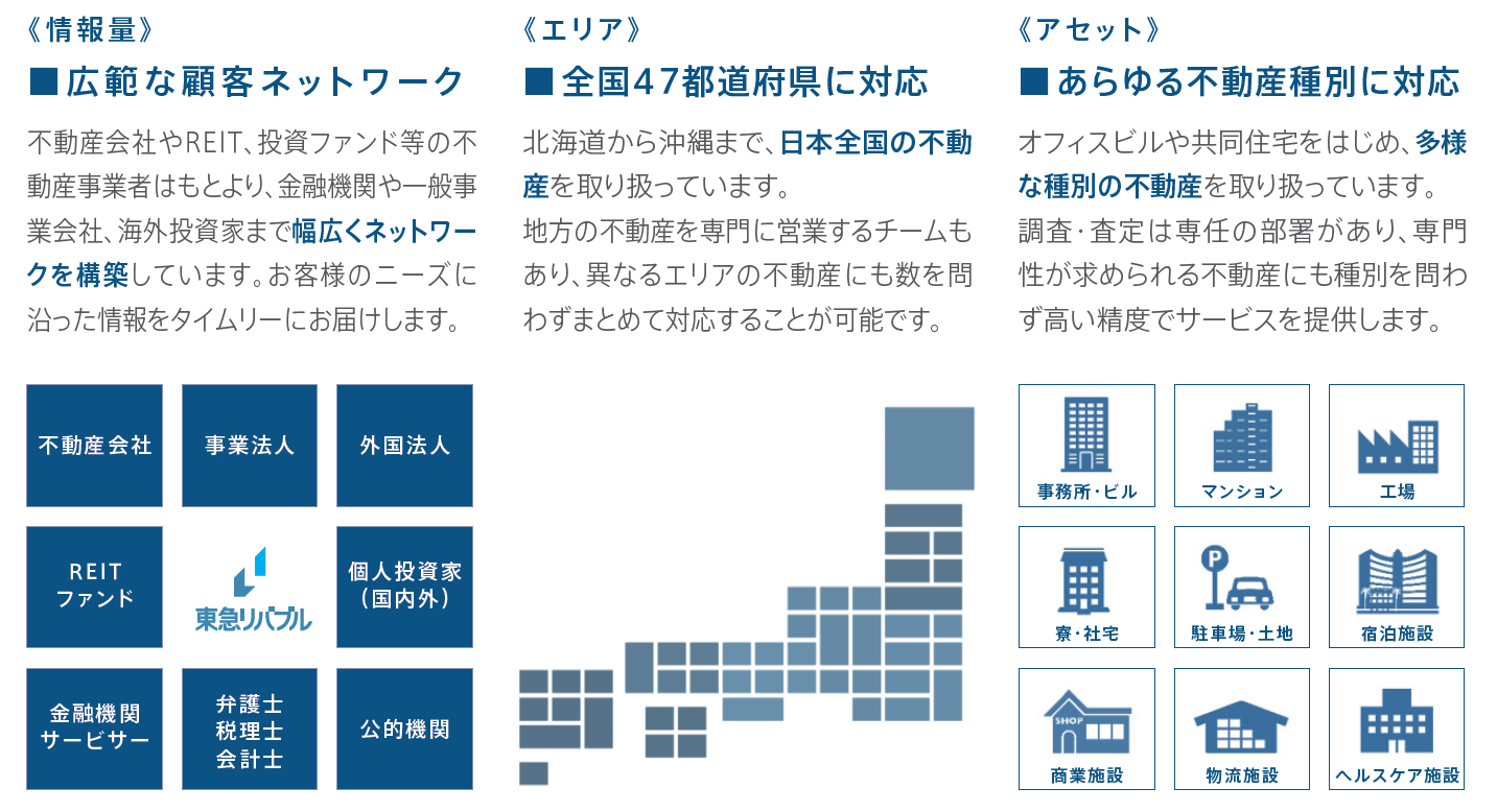 この長年の経験で培った専門ノウハウや豊富なデータに基づき、日本全国・あらゆる種別の不動産取引を支援しております。
