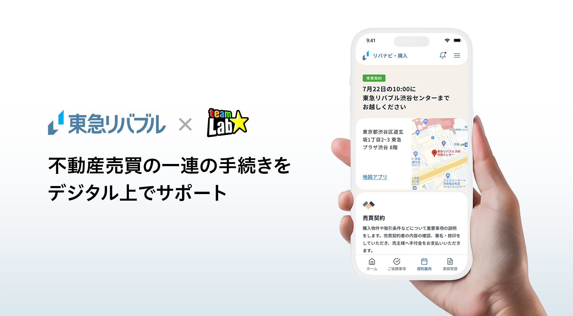 東急リバブル株式会社(本社:東京都渋谷区、代表取締役社長:小林 俊一)は、当社の仲介で不動産を購入・売却される個人のお客様向けに、売買契約の締結から決済・引渡し後までの一連の手続きにおいて、デジタル上(パソコン・スマートフォン)で資料の確認や各種申込みができる新サービスシステム『リバブルサポートナビ(以下、「本サービス」)という。』を、チームラボ(本社:東京都千代田区、代表:猪子 寿之)と共同開発しました。