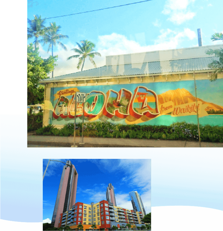 東側にはアラモアナやワイキキ、西にはダウンタウンやホノルル港があります。カカアコはハワイ州オアフ島の南岸に位置し、町全体がウォールアートで彩られたハワイ屈指のフォトジェニックなスポットです。