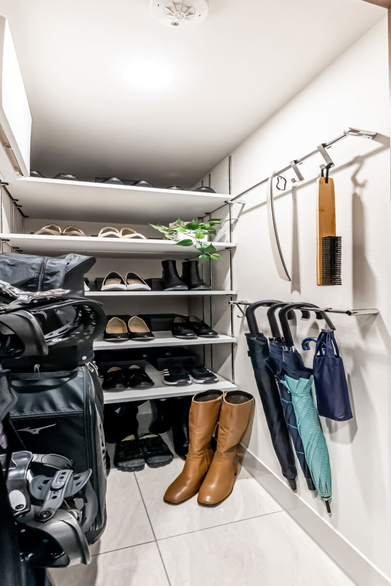 可動棚で、住まう人の靴・収納品に合わせて自由に高さを調整可能にしました。また、壁面には傘や小物を掛けられるバーを設置しました。