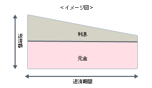 | 元金均等返済 | 毎月の返済額が徐々に少なくなり、将来の返済負担が軽くなる。 同じ返済期間であれば元利均等返済より総返済額が少ない。 元利均等返済に比べ、返済開始当初における元金の減少が早い。 |