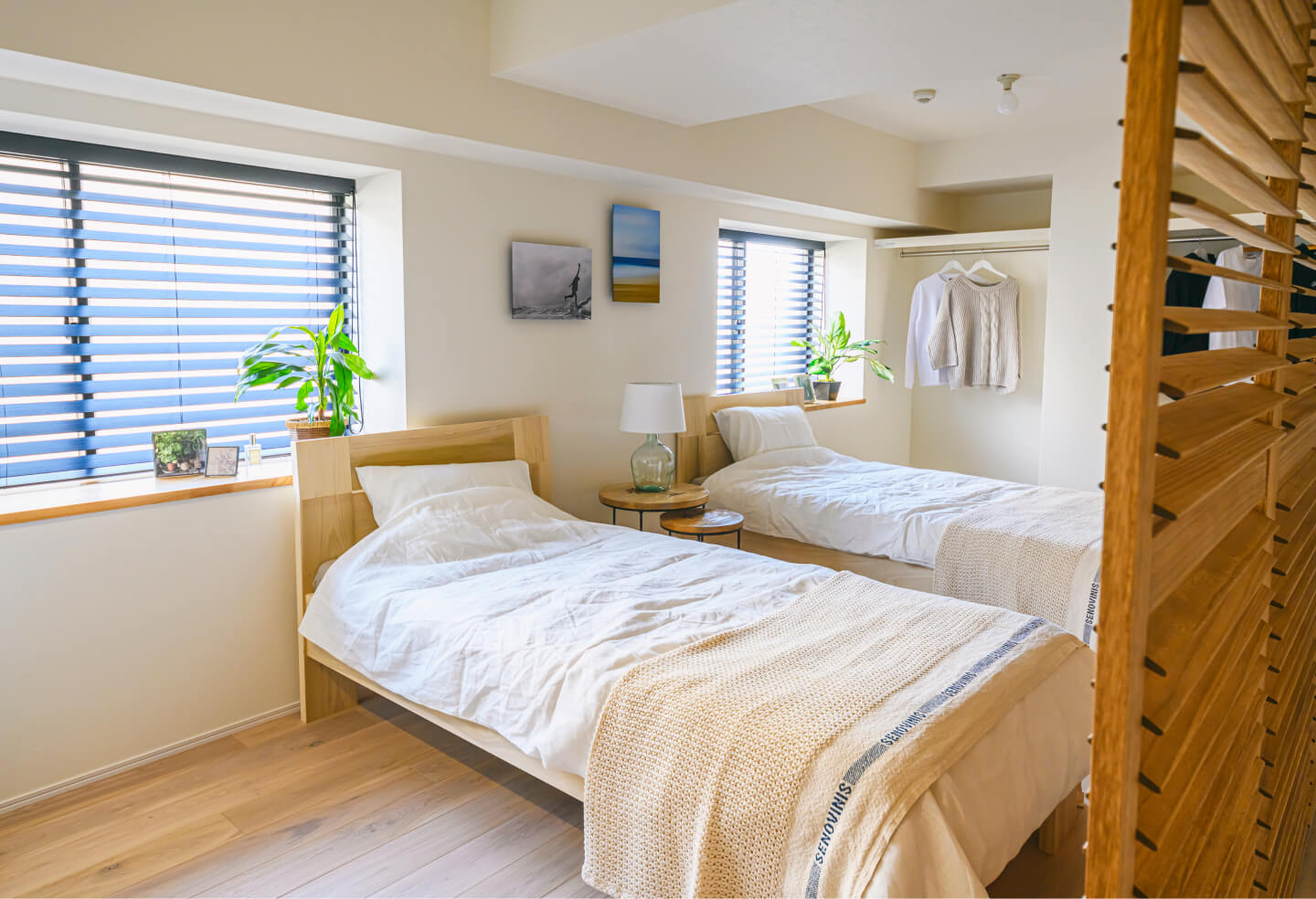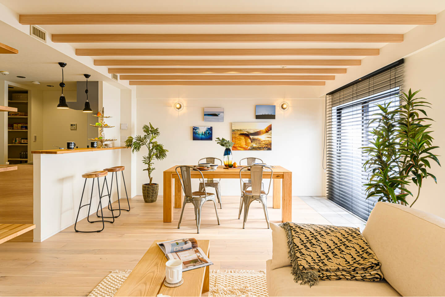 西海岸のコンドミニアムをコンセプトに、白い壁と天井、リビングの天井に木製の梁、寝室を分ける扉はルーバーとし爽やかな南国の風が通り抜けるかのようなホテルのひと部屋を連想させます。
