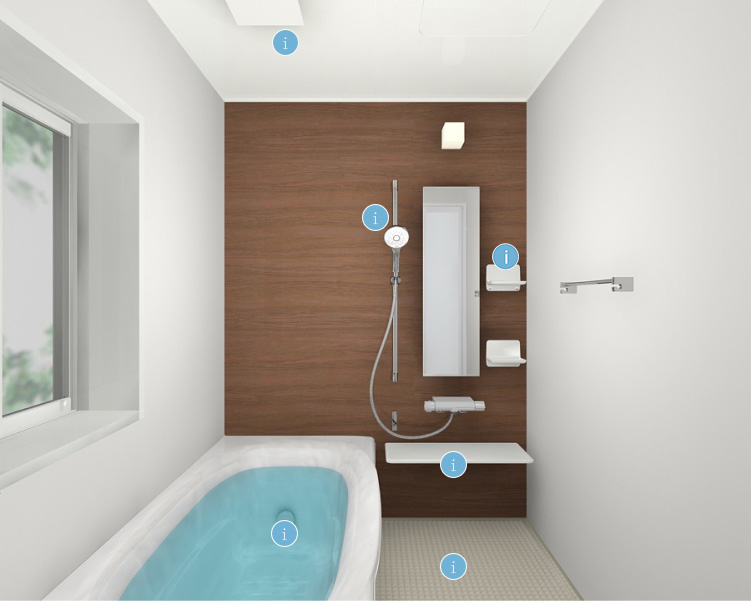 清潔感、使い易さ、お掃除のし易さをひとまとめにしたシステムバスをご用意しております。 水はけよくヒヤッとしない床、汚れの付きにくい折れ戸タイプドア、保温構造の浴槽はお湯が冷めにくく地球にもお財布にも優しい仕様です