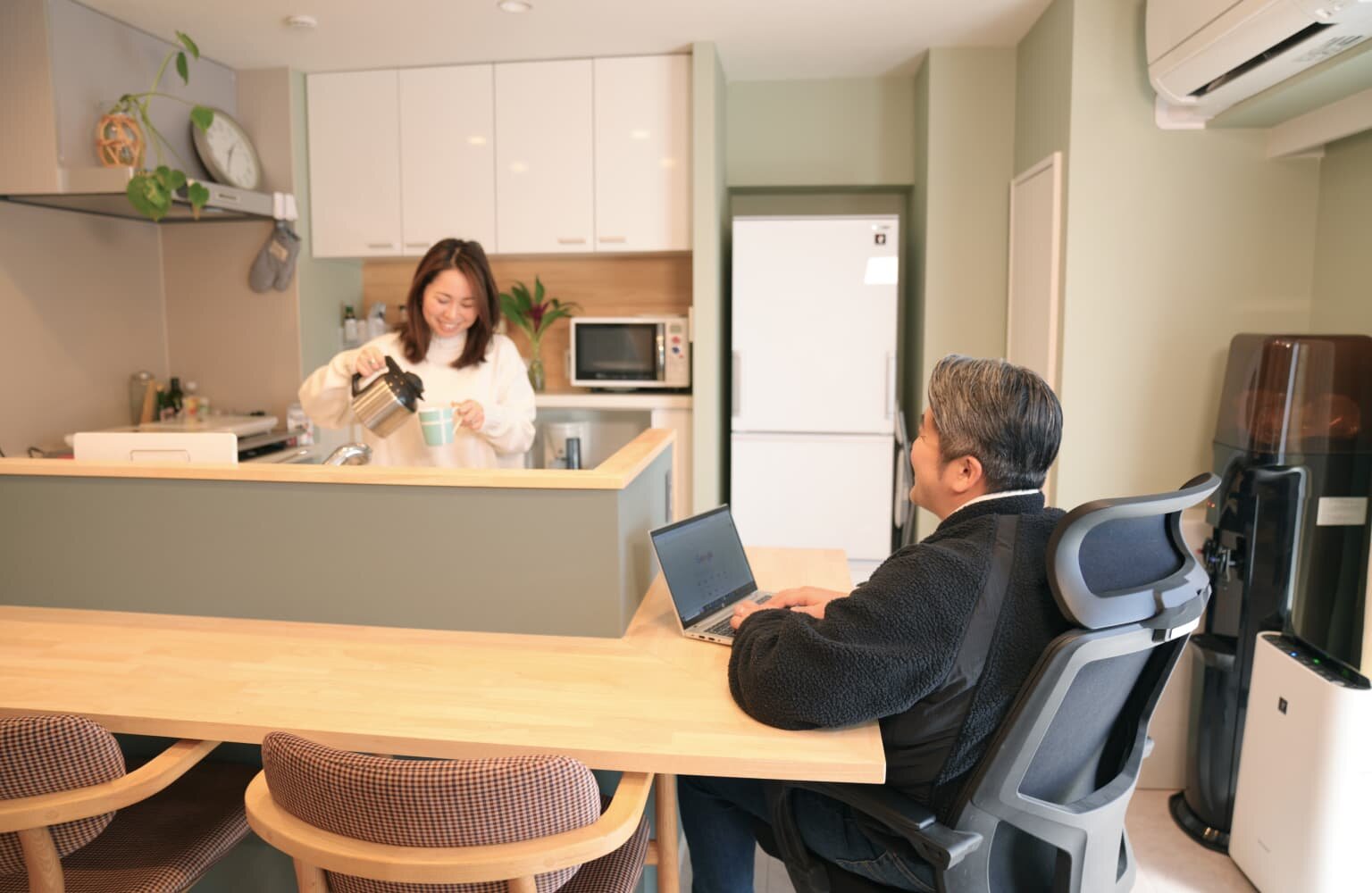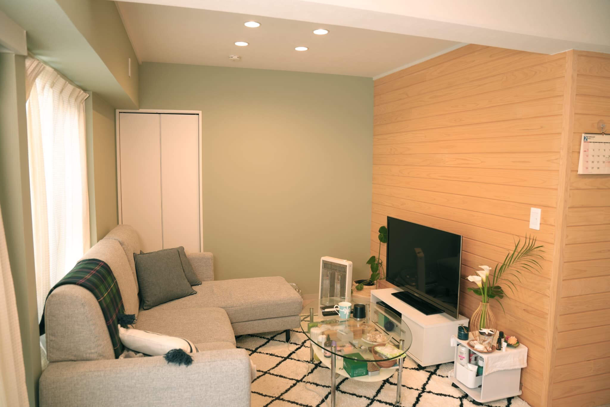 ご結婚は2022年の夏。まだ新婚ホヤホヤのNさんご夫婦は、ご主人の会社の先輩が催した食事会で奥さまと出会い、2人だけの時間を重ねてきました。新宿の喧騒から離れた公園近くのリノベーションマンションを購入したのは、入籍の半年ほど前。奥さまは、淡い緑色と木目調のパネルを配したLDKの壁に一目惚れしたそうです。