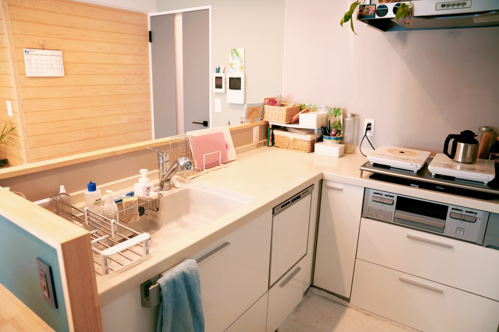 キッチンの奥行き、幅、ワークトップの高さ、収納の多さも、購入のポイントになったといいます。「もともとの間取りではコンロやシンクが壁に張り付いていたそうですが、リノベーションの際に向きを変えて対面式にしたと聞きました。作業するスペースが広くなり、使い勝手は良くなったと思います。買ってきたばかりの食材の仕分けもワークトップでパパッとできます。リビング側にあるカウンターとの間に目隠しになる仕切りがあるのもいいですね」
