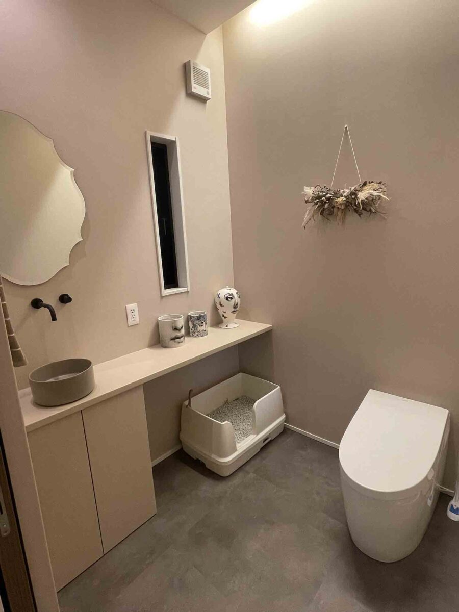 「ニオイもそうなのですが、トイレの砂がリビングに落ちるのが気になってしまって。なので、トイレを広く作って、猫のトイレも人間のトイレと同じ部屋に入れられるようにしました」