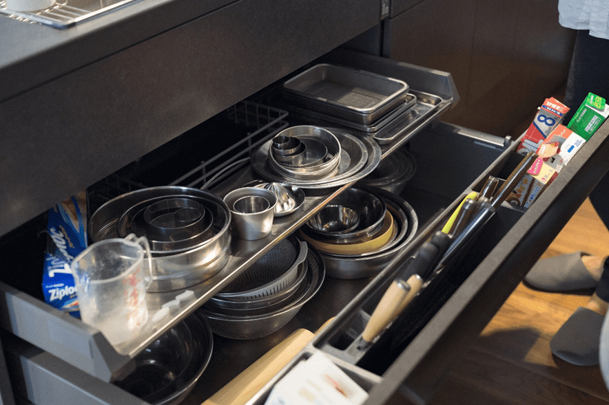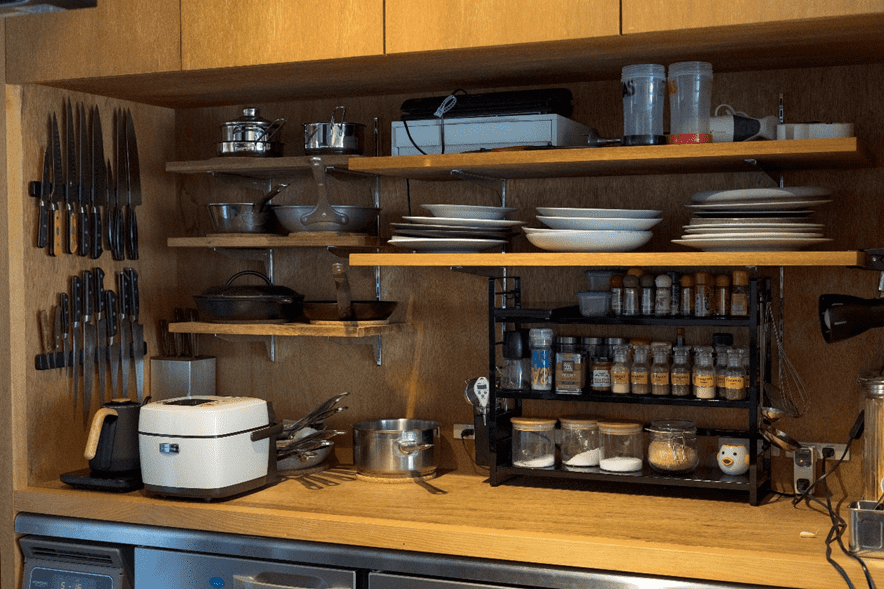 大量の調理道具があってもゴチャゴチャしない秘訣は、キッチンの収納力にあります。