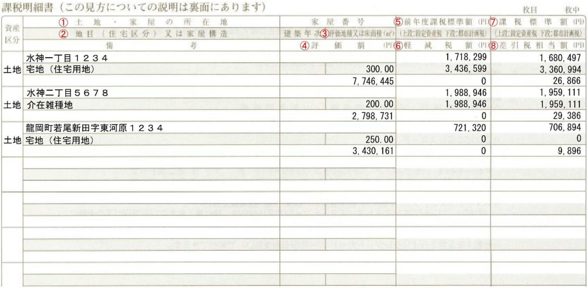 この評価証明書では、④の部分固定資産税評価額が書かれています。一番上の水上一丁目1234の固定資産税評価額は、7,746,445円とわかります。