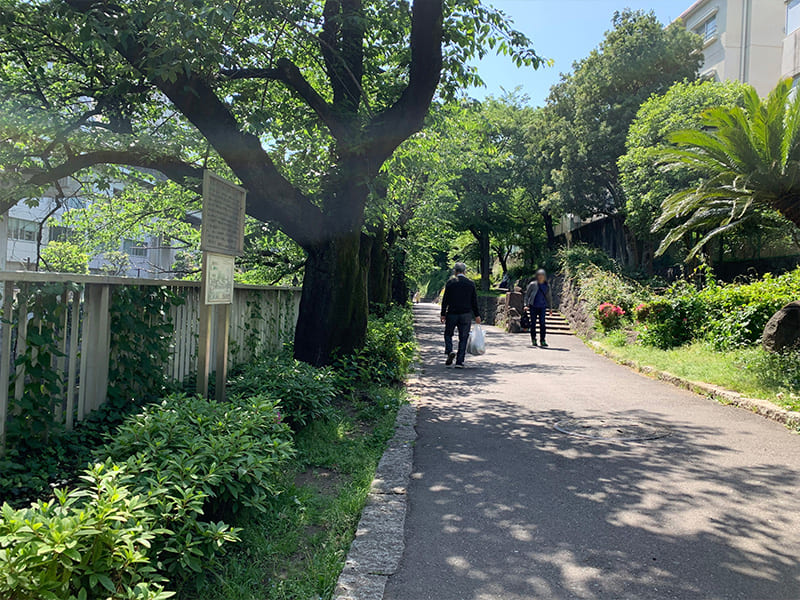 「春日通り」に戻って後楽園方面へ。「小石川五丁目」の交差点を右に入るとあるのが「播磨坂」です。1960年(昭和35年)に舗装が行われた際、桜の木約120本が植えられました。中央部はベンチなどが配された緑道で、地域住民の憩いの場となっています。