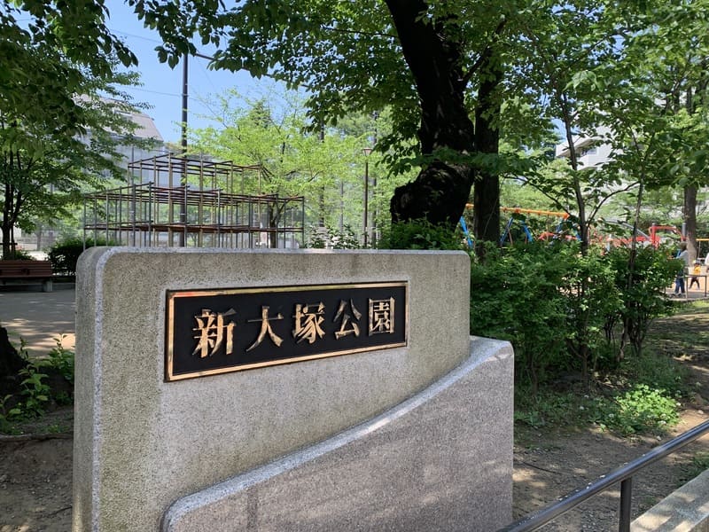 春日通りを池袋方面へ進み、「大塚一丁目」の交差点を左折し「跡見学園前」の信号を左に入ると見えてくるのが「新大塚公園」です。球技グラウンドやジャングルジム、複合遊具がある公園で、植栽も多く、都会のオアシスのような空間です。