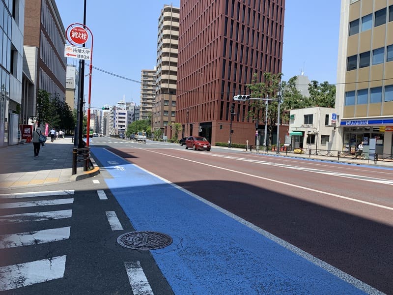 駅を出ると目の前に通っているのが「春日通り」です。春日通りは、池袋から文京区・台東区を経由して、墨田区へと延びる道路の通称。茗荷谷駅前は片側2車線と広々としており、自転車専用車線もあります。