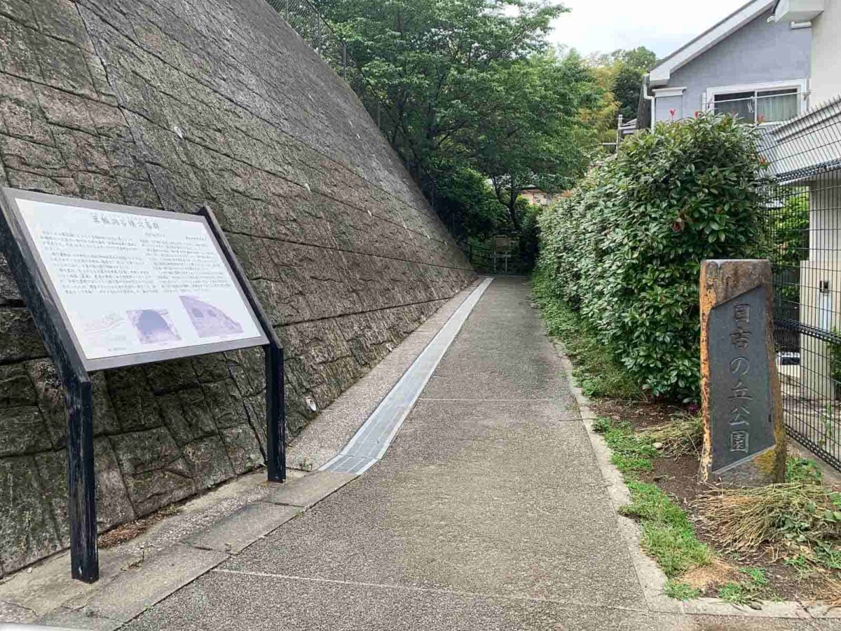 高架下を過ぎ、1本目を左へ曲がって次を左折すると、「日吉の丘公園」の入口が目に入ってきます。歩みを進めると、目の前には150段の階段が…。
