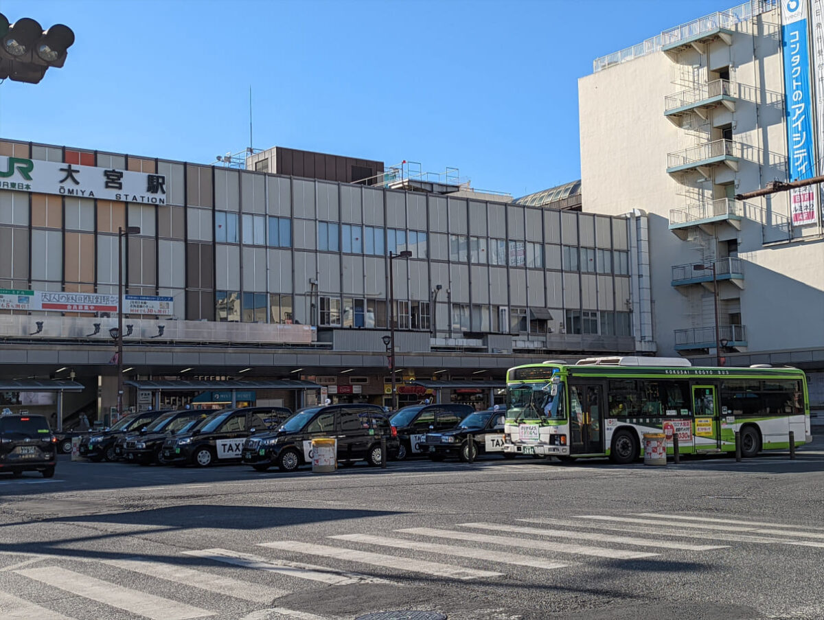 西口を出て、大宮駅西口バスロータリーから出発します。駅前には大型の商業施設が集まり、人通りも多く、バスの発着本数も豊富です。駅から離れたエリアへの移動にはバスが活発に利用されています。バス停でバスを待つ人たちが、ロータリーに多く見られました。