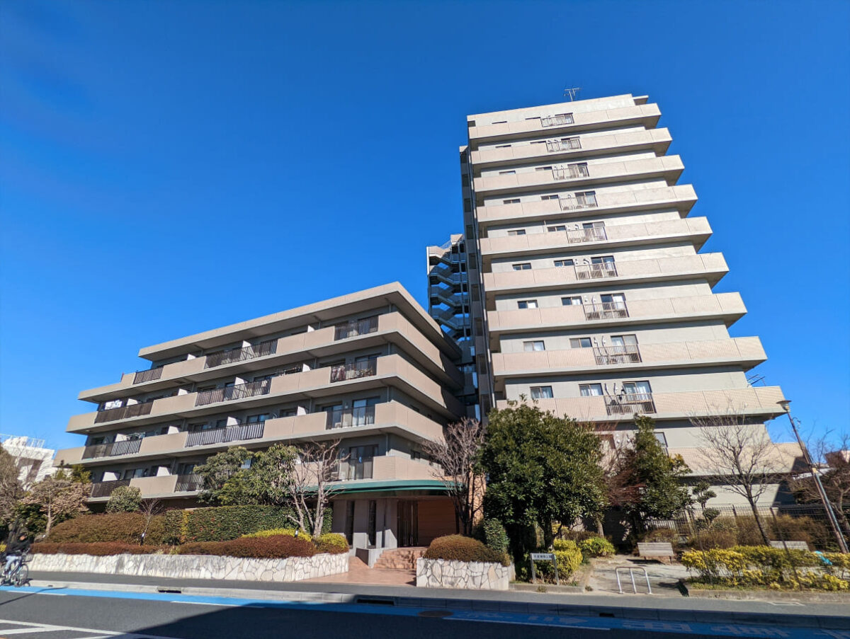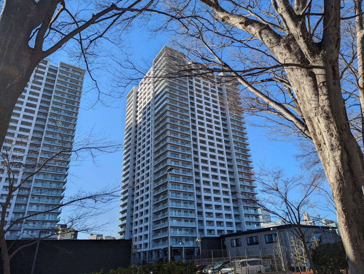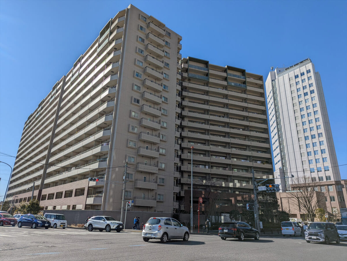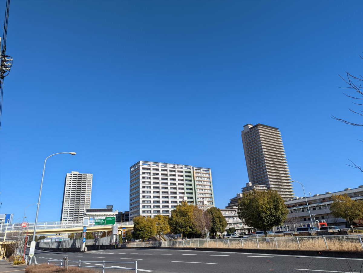 県道56号線と交差する交差点付近から、急激に高層・大規模なマンション群に風景が変わります。駅から徒歩で20分ほど離れた位置に、複数のタワーマンションが建ち並ぶのが見えてきます。