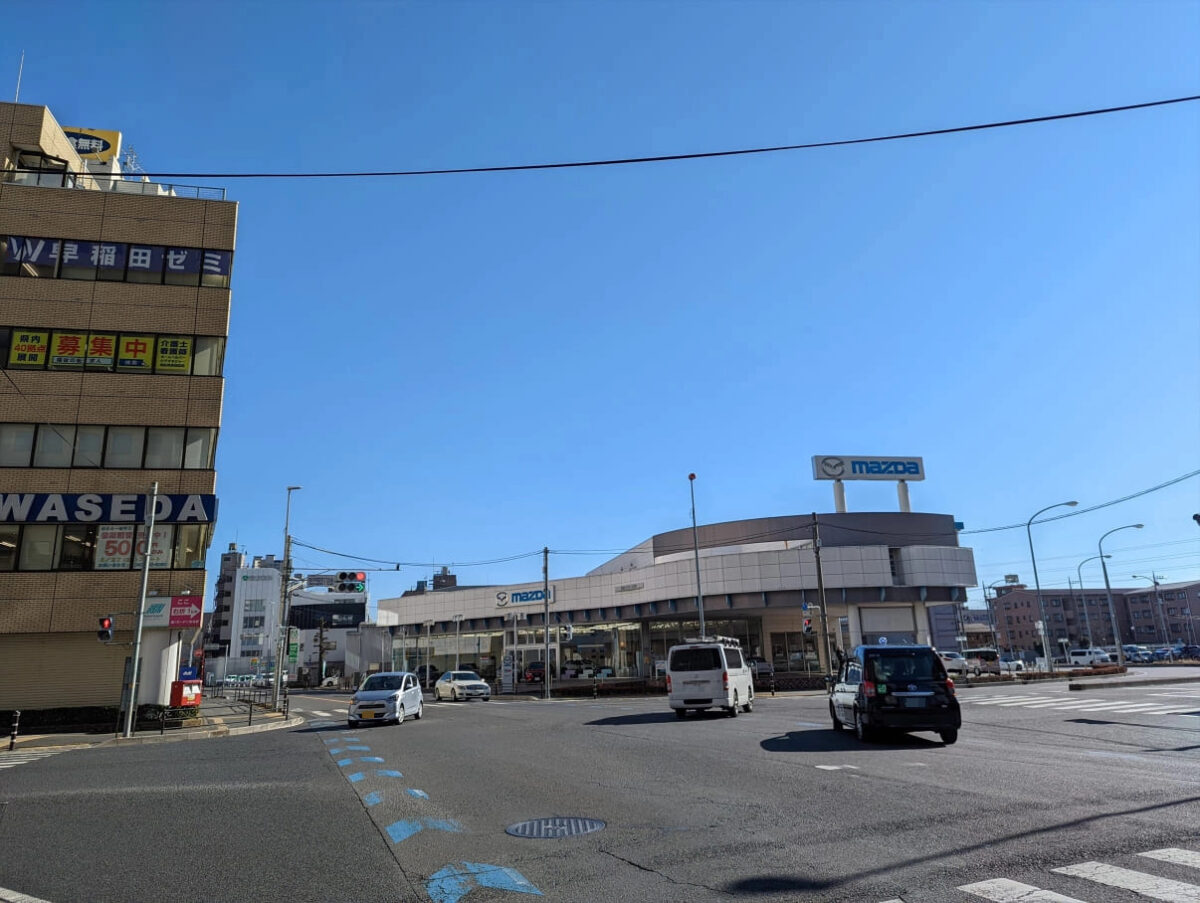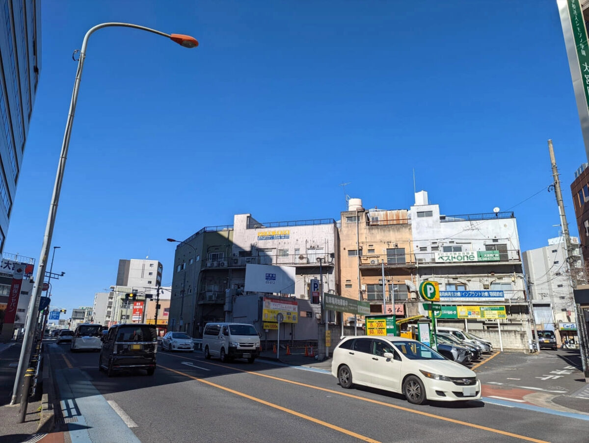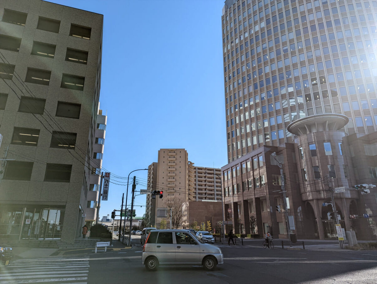交差点付近までは大型の商業施設やビルが続き、再開発で建設中の建物も多く、今後駅前がさらに発展するのがわかります。