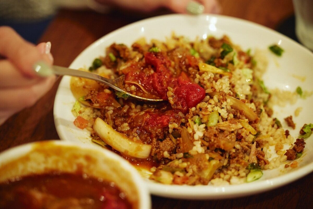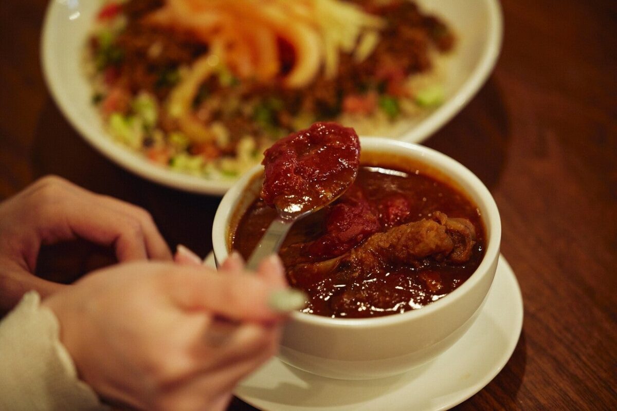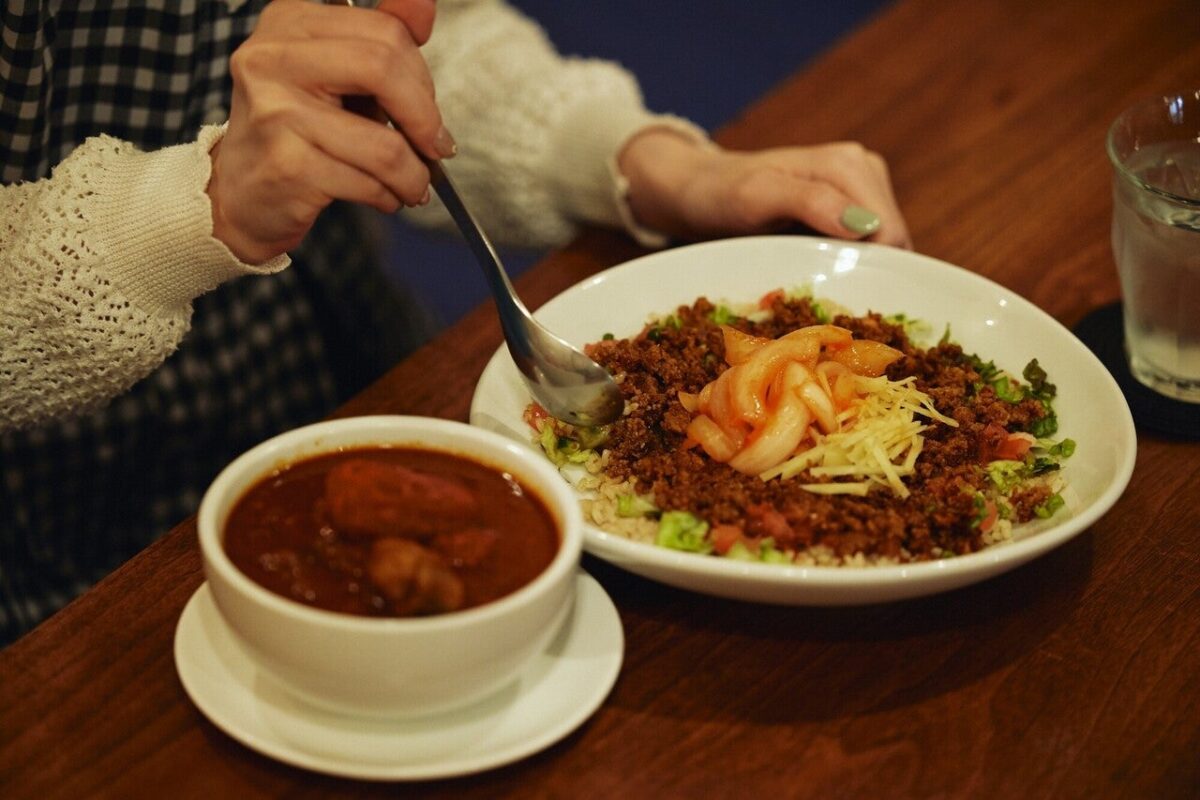 珍しいのが、ご飯に三分づき玄米を使用していること。白米より少し固めで、噛み応えが良く、キーマカレーの味をよく引き立てています。カレー×カレーの掛け合わせだけでなく、ご飯との相性まで計算された一品。カレーの奥深さを体験しました。