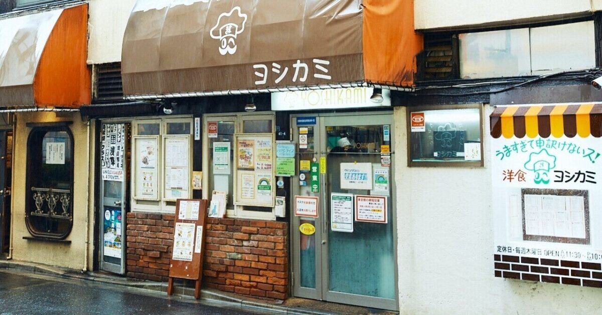 年季が入った良い味わいの店構えは、洋食屋『ヨシカミ』。「うますぎて申し訳ないス!」という茶目っ気と、料理への自信が垣間見えるキャッチコピーに惹かれてしまいました。