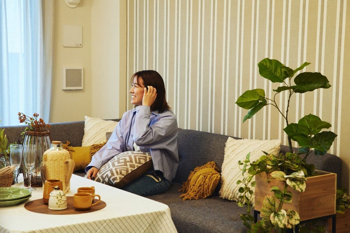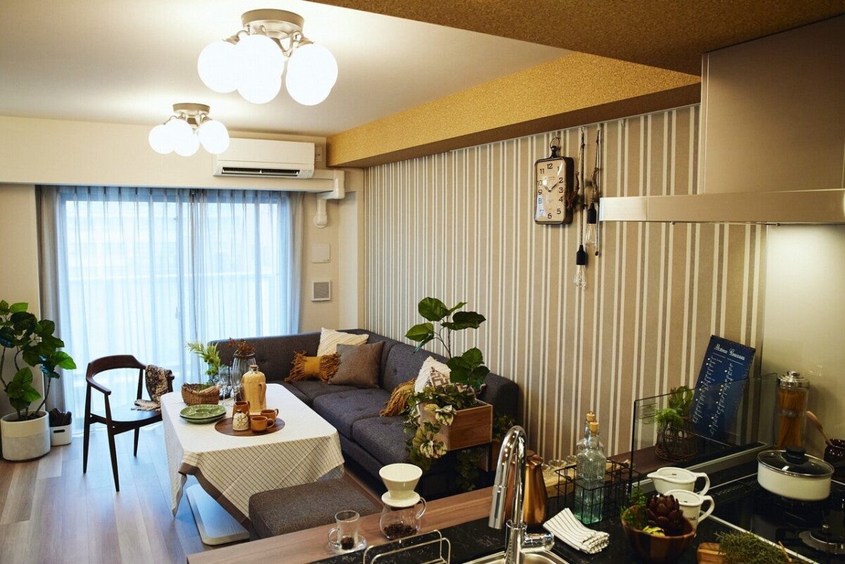 アクセントクロスが特徴的なお部屋ですが、カラーが落ち着いているため、いろいろなスタイルのインテリアとも合いそう。