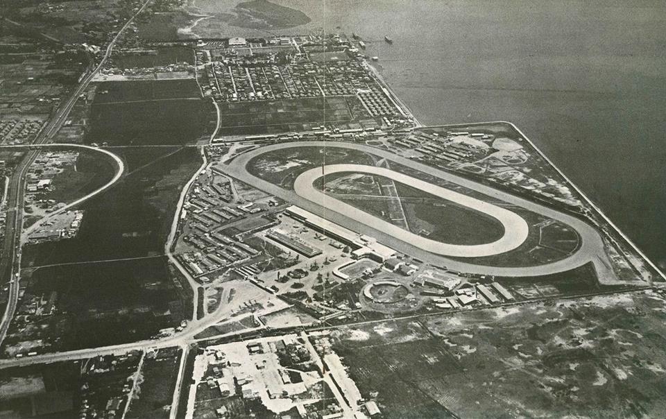 1950年10月29日、日本初のオートレース場が船橋競馬場内に誕生。1968年に南船橋駅の南側に移転するまでは、馬場内のダート走路でオートレースが開催されていました。航空写真でみられる二重の楕円のうち、内側のコースがオートレースのコースです。