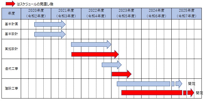 必要駐車台数の見直しによる立体駐車場の整備や物価上昇等に伴い概算工事費を変更しました。また、鉄骨の納期の長期化による工期への影響や一部設計の修正に伴う影響により事業スケジュールの見直しを行いました。