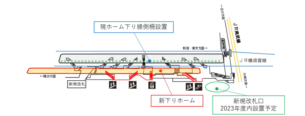 また、横須賀線 武蔵小杉駅のホーム上混雑緩和対策として、下りホーム(横浜・羽沢横浜国大方面)新設の工事を進めてまいりました。工事が順調に進んでいることから、2022年12月18日(日)より新下りホームを供用開始する運びとなりましたので、お知らせします。