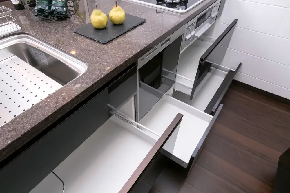 鏡の裏に収納棚を設けた、三面鏡付き洗面化粧台を採用。オーラルケアグッズ・ヘアケアグッズなどをすっきりと整理でき、洗面室まわりの清潔感をキープしやすくなります。