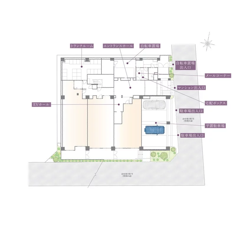 また、緑映える美しい景観をコンセプトに設計された植栽は、シンボルツリーにヒメシャラ、心地よい芳香を放つキンモクセイ、低木はアジサイや常緑のアオキ、開花期の違う花々など、四季の変化による癒しや心地よさを演出しています。