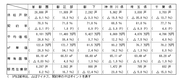 売れ行き面では、初月契約戸数の合計が1万8906戸で月間契約率の平均は70・3%。前年(70・4%)比では0・1㌽ダウンも、3年連続の70%台となった。エリア別では神奈川県と埼玉県が60%台、都区部、都下、千葉県は70%台に乗せている。また、累積の契約戸数は2万2493戸で累積契約率は83・7%となり、前年(86・7%)を3・0㌽下回っている。