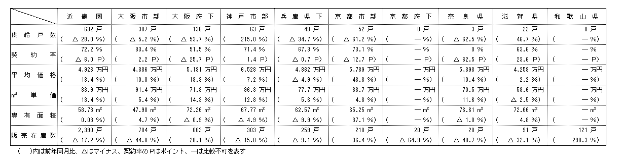 供給戸数をエリア別にみると、大阪市部が前年同月比5・2%減の307戸、大阪府下が53・7%減の136戸、神戸市部が215・0%増の63戸、兵庫県下が34・7%減の49戸、京都市部が61・2%減の52戸、奈良県が62・5%減の3戸、滋賀県が46・7%増の22戸。神戸市部と滋賀県以外のエリアで前年同月を下回った。前月に初回売り出し物件が大量に供給された反動とみられる。