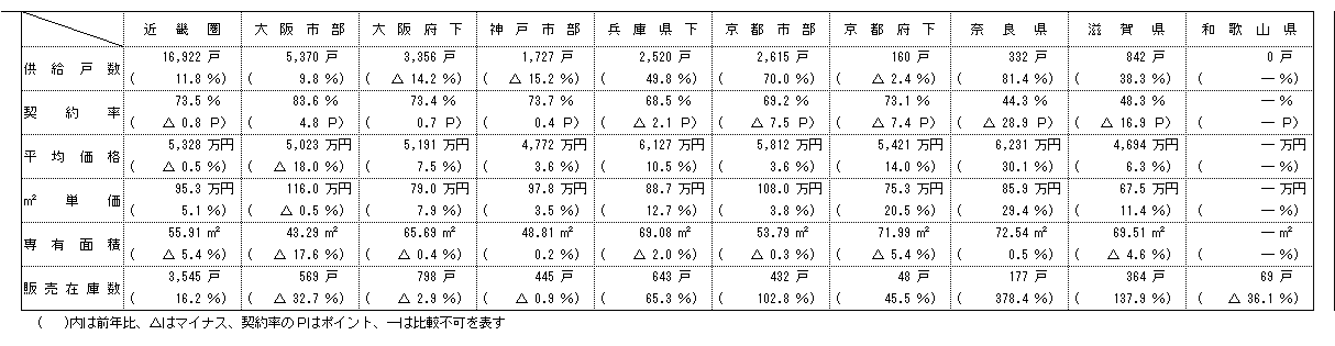 エリア別の発売戸数をみると、大阪市部が前年比9・8%増の5370戸、大阪府下が14・2%減の3356戸、神戸市部が15・2%減の1727戸、兵庫県下が49・8%増の2520戸、京都市部が70・0%増の2615戸、京都府下が2・4%減の160戸、奈良県が81・4%増の332戸、滋賀県が38・3%増の842戸、和歌山県が0戸。