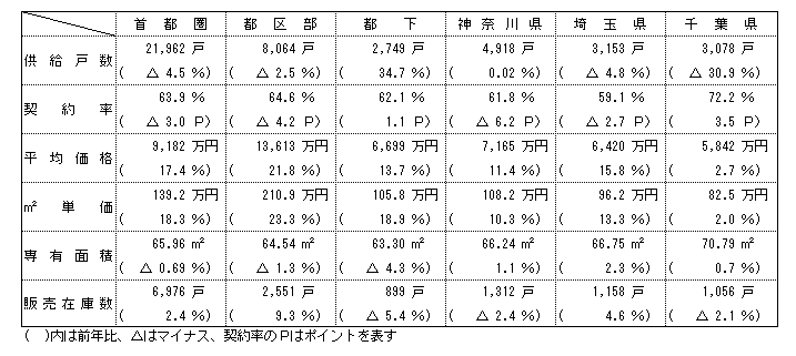 売れ行き面では、初月契約戸数の合計が1万4040戸で月間契約率の平均は63・9%。前年(66・9%)比では3・0㌽ダウンし、2年連続で70%を下回った。エリア別では千葉県が70%台となるも、都区部、都下、神奈川県が60%台、埼玉県は50%台となっている。また、累積の契約戸数は1万7399戸で累積契約率は79・2%となり、前年(81・0%)を1・8㌽下回っている。