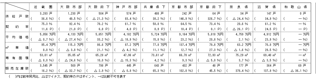 供給戸数をエリア別にみると、大阪市部が49・5%増の1230戸、大阪府下が21・3%減の504戸、神戸市部が83・4%増の574戸、兵庫県下が38・2%増の488戸、京都市部が146・9%増の242戸、京都府下が326・7%増の64戸、奈良県が24・4%減の34戸、滋賀県が34・9%増の147戸。