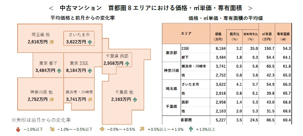 アットホームは28日、首都圏における25年12月の住宅売り出し価格の動向を公表した。戸当たり平均価格で、中古マンションは5227万円(前年同月比24・5%増)だった。特に、東京23区は8184万円(35・0%増)と、調査を開始した17年以降で初めて8000万円台に達した。前月比でみても3・2%の上昇と3%台の強い上昇が2カ月連続。アットホームラボ執行役員の磐前淳子氏は「東京23区は25年の年間を通じて上昇の勢いが続いた」と話す。