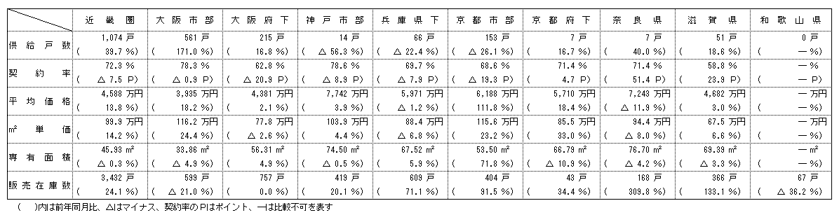 供給戸数をエリア別にみると、大阪市部が171・0%増の561戸、大阪府下が16・8%増の215戸、神戸市部が56・3%減の14戸、兵庫県下が22・4%減の66戸、京都市部が26・1%減の153戸、京都府下が16・7%増の7戸、奈良県が40・0%増の7戸、滋賀県が18・6%増の51戸。