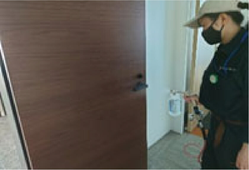専用の噴霧器を使用し、抗菌剤の粒子を天井の高さまでムラなく充満させます。床・壁、ドアノブ、PCキーボードなど、人が触れる全てのモノを、細かな粒子でコーティングします。